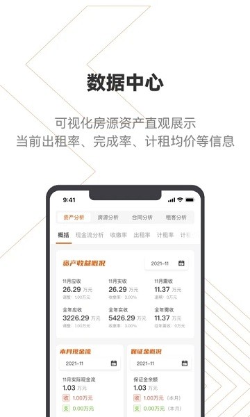 2.可视化不动产资产直观展示当前入住率、竣工率、平均租金等信息。