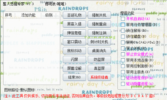 整人恶搞专家,是一个专门用来整人的工具。在支持多种整人设置模式,包括蓝屏、桌面消失、窗口抖动、闪屏、强制关机、禁用鼠标等整人模式。绝对让被整的小伙伴大吃一惊。