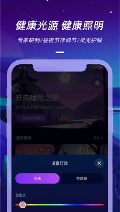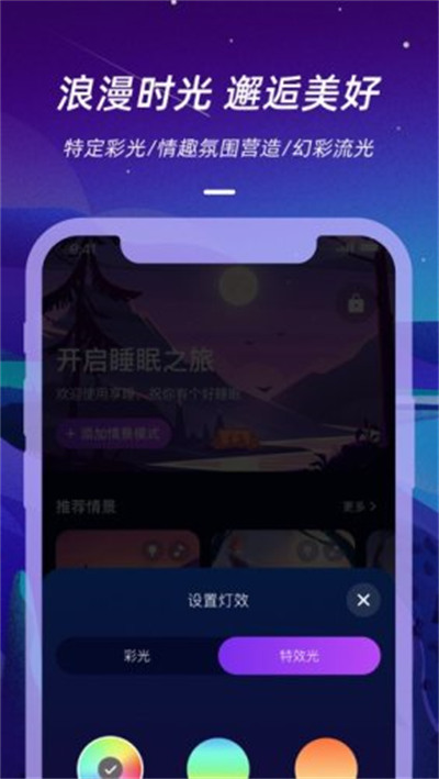 2、通过手机软件随心调光调色,多种场景灯光模式自由切换,仿生助眠烛光模式,打造安心睡眠光环境。