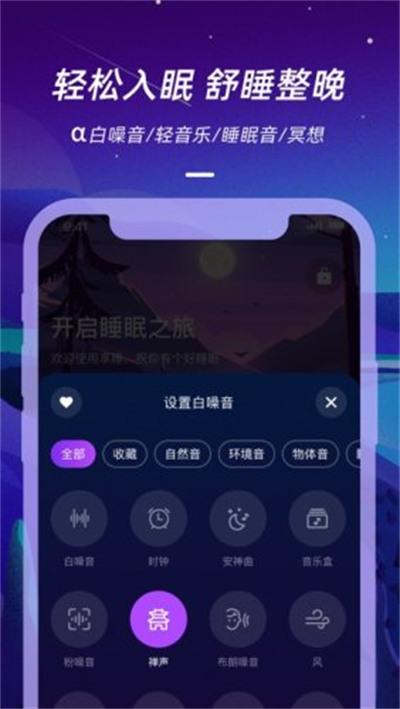 3、还有α白噪音、轻音乐、睡眠音、冥想等声音也可以播放,还有专家研制的不同入眠的声音可以播放。