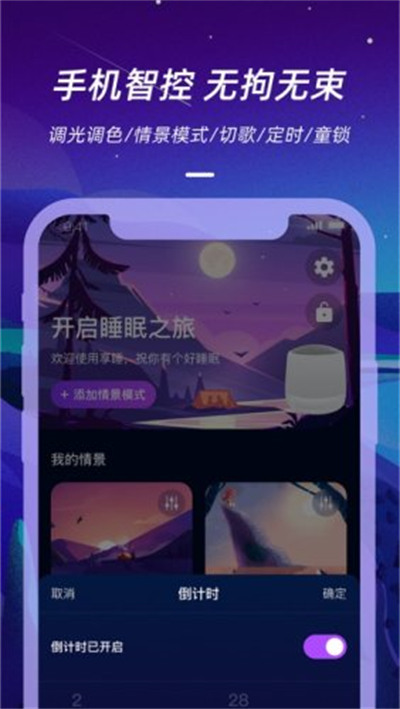 仙踪云助眠技术采用顶尖医学科技和AloT技术融合,为人类提供健康睡眠解决方案,让每个自由享受健康睡眠的乐趣,“好的睡眠,使人身心健康,元气分发,让人感觉容光焕发,使人心神得到安逸,软件中还可以随心调光调色,多种场景灯光模式,自主切换,仿生助眠效果,声光双效,轻松入眠,舒眠整晚,且适合多种场合使用。