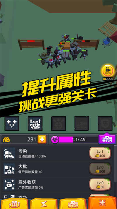 游戏扩大僵尸军队的规模,在荒芜的世界里壮大自己的丧尸大军,杀死对手,得整个游戏的开发更加持续,每个僵尸都有不同的属性和技能,玩家需要适当匹配他们的技能,建立一支强大的僵尸军队。