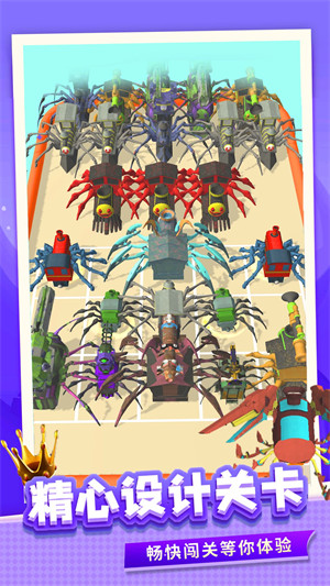 蜘蛛生存模拟最新版是一款生存冒险游戏,在游戏中玩家需要躲开各种各样的障碍,在精心设计的关卡中进行闯关,游戏的玩法上头,十分好玩,非常的轻松好玩,快来聚集自己的彩虹蜘蛛怪物小队,游戏中还能解锁一些其他的怪物。