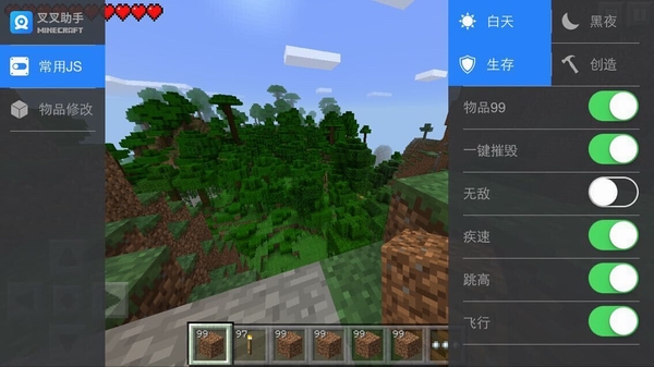 在生存模式下,经常会遇到各种资源的缺乏,挖矿所需的时间太长了,收集的量又不够建筑。修改物品数量就可以轻松达到目的!有时候在地底挖矿,一个不小心转身遇到爱。JJ怪就在你旁边boom,更惨的莫过去挖着挖着后面被僵尸一推,掉熔岩里了,连物品都没了!开启无敌!那就不用怕死!勇敢的开扩地穴,探索新世界。还有大跳、疾跑、一键挖矿等等!