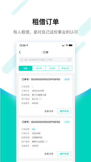 软件还有订单模块,商家可以在此模块查看到租借到自家充电宝的人员信息,租借时间、租借人的名称、以及租借的充电宝的编号等,可以更好的管理设备,也能防止设备的丢失,安全性十足。