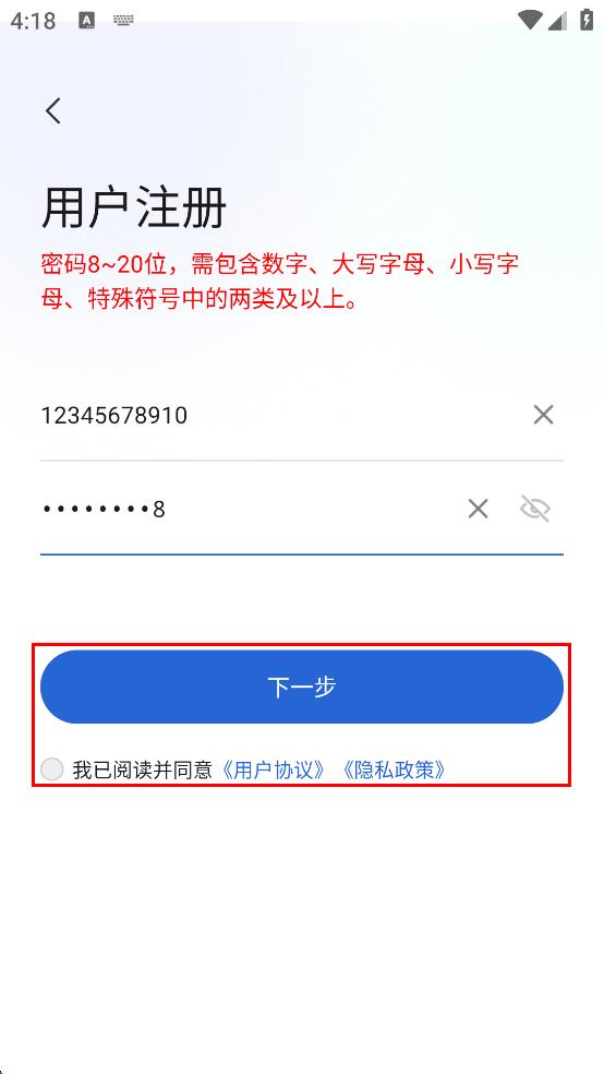 4、勾选“我已阅读并同意用户协议,隐私政策,点击“下一步”按钮,继续后续的用户注册流程。