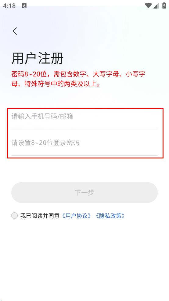 3、在用户注册页面,输入手机号码或邮箱,然后设置8 - 20位且包含数字、大写字母、小写字母、特殊符号中两类及以上的登录密码。
