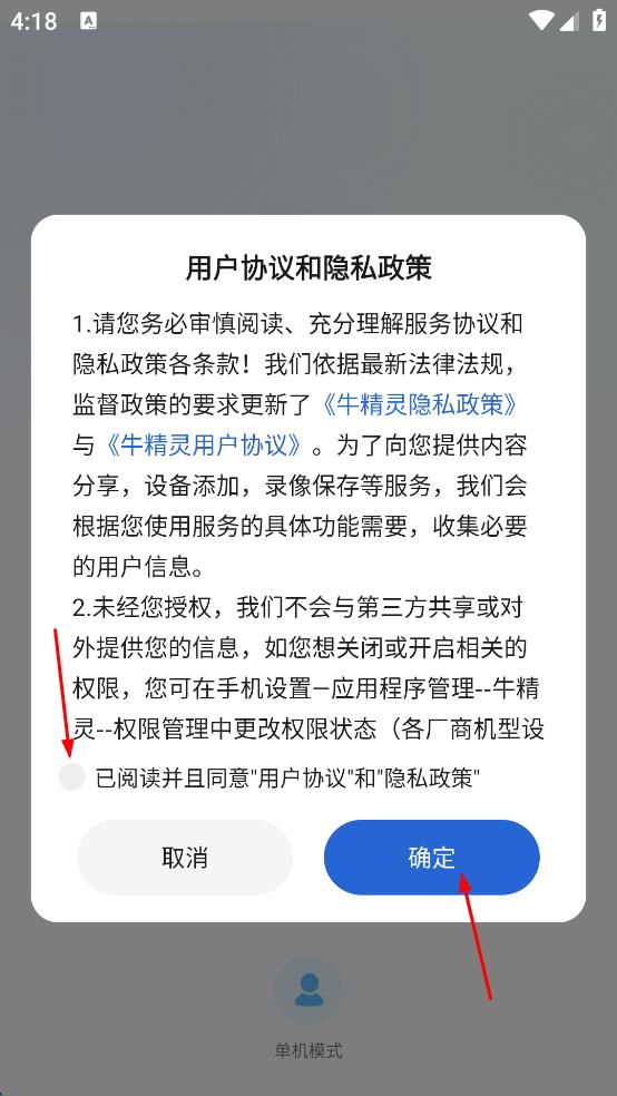 1、打开牛精灵APP,进入用户协议和隐私政策页面,仔细阅读相关内容后,勾选“已阅读并且同意用户协议和隐私政策”,点击“确定”按钮,进入登录页面。