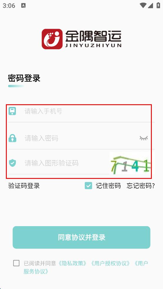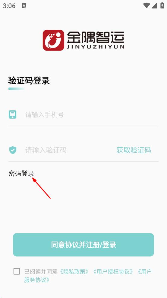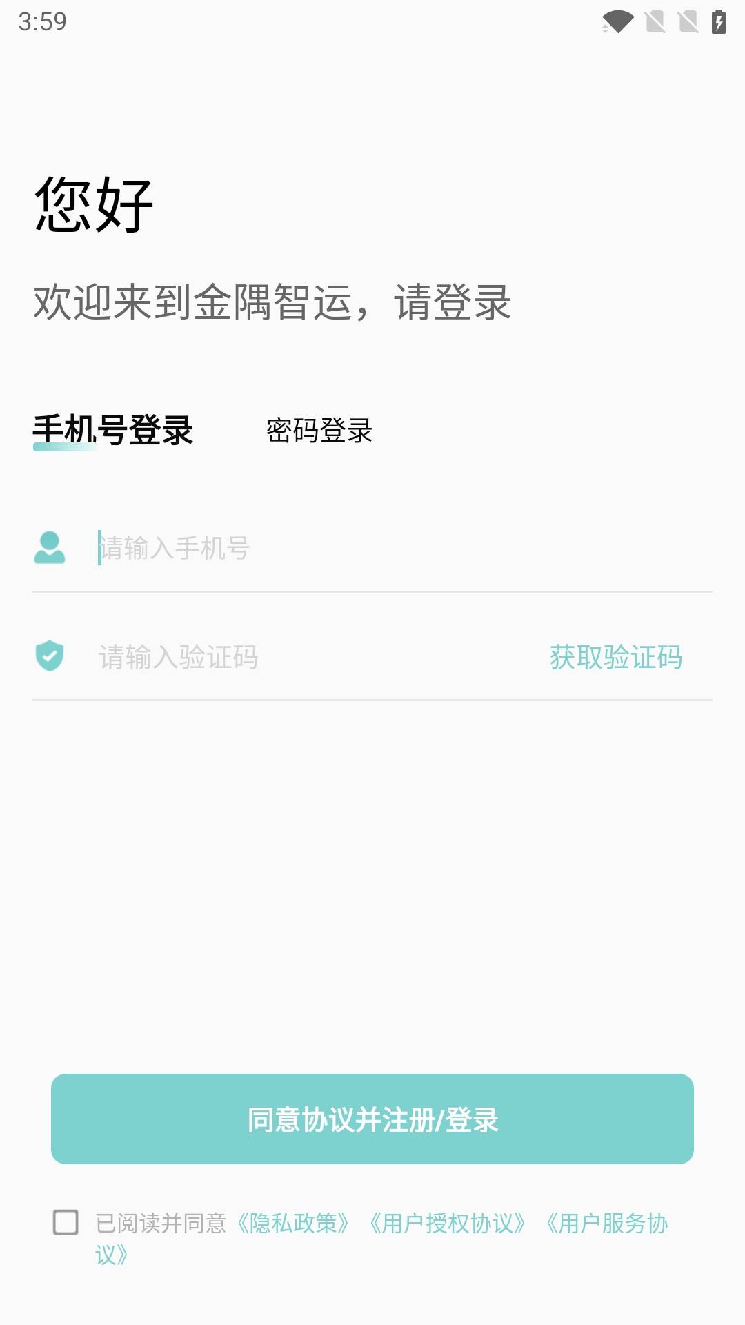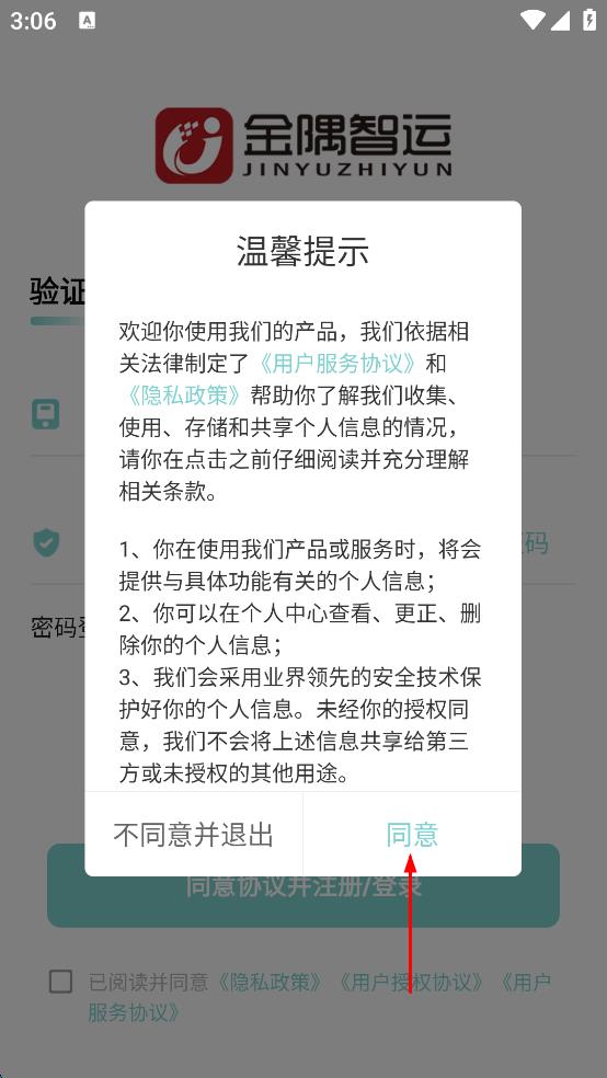 1、打开金隅智运APP,在“温馨提示”弹窗中,点击“同意”,进入登录选择页面。