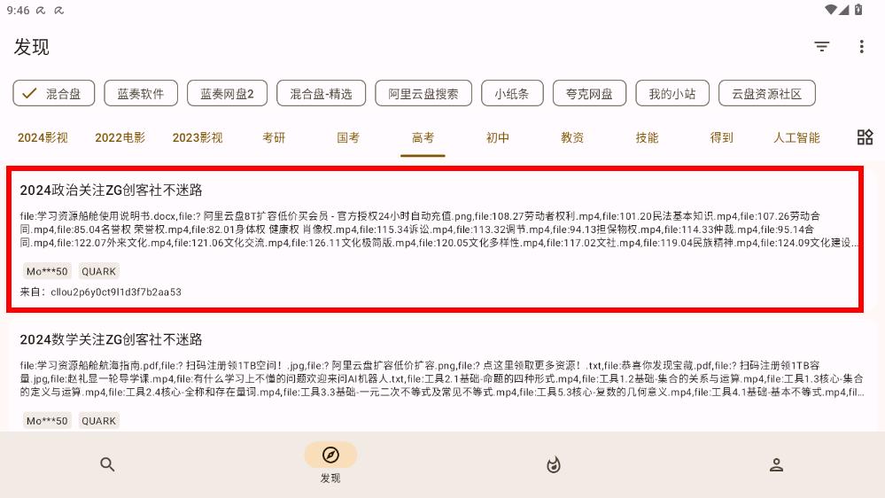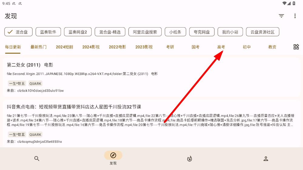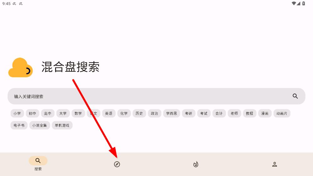1、在混合盘搜索界面,点击底部发现选项进入发现页面。
