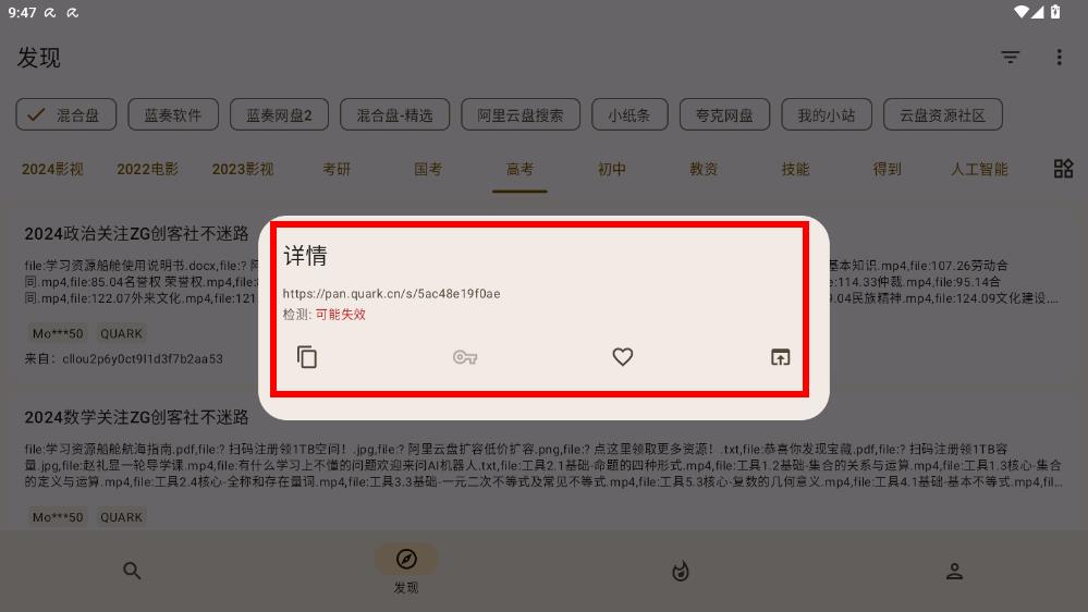 4、点击目标资源,在弹出的详情界面,点击链接图标获取资源链接进行下载等操作。