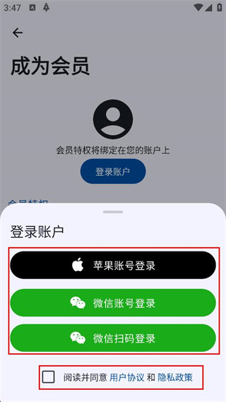 4、勾选阅读并同意用户协议和隐私政策,选择一种方式进行登录。