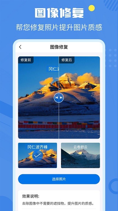 3.对于模糊、破损、褶皱的老照片,可以智能修复,对分辨率低的老照片进行Ai无损放大。