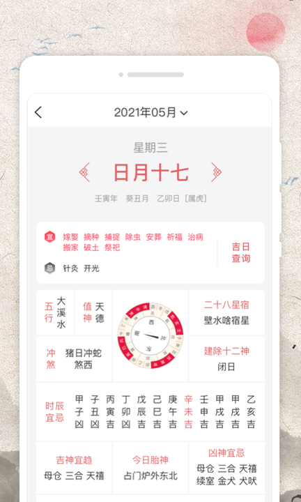 3.农历、万年历、公历、历书一目了然,一天中的时好时坏、禁忌、注意事项都会公布于心。
