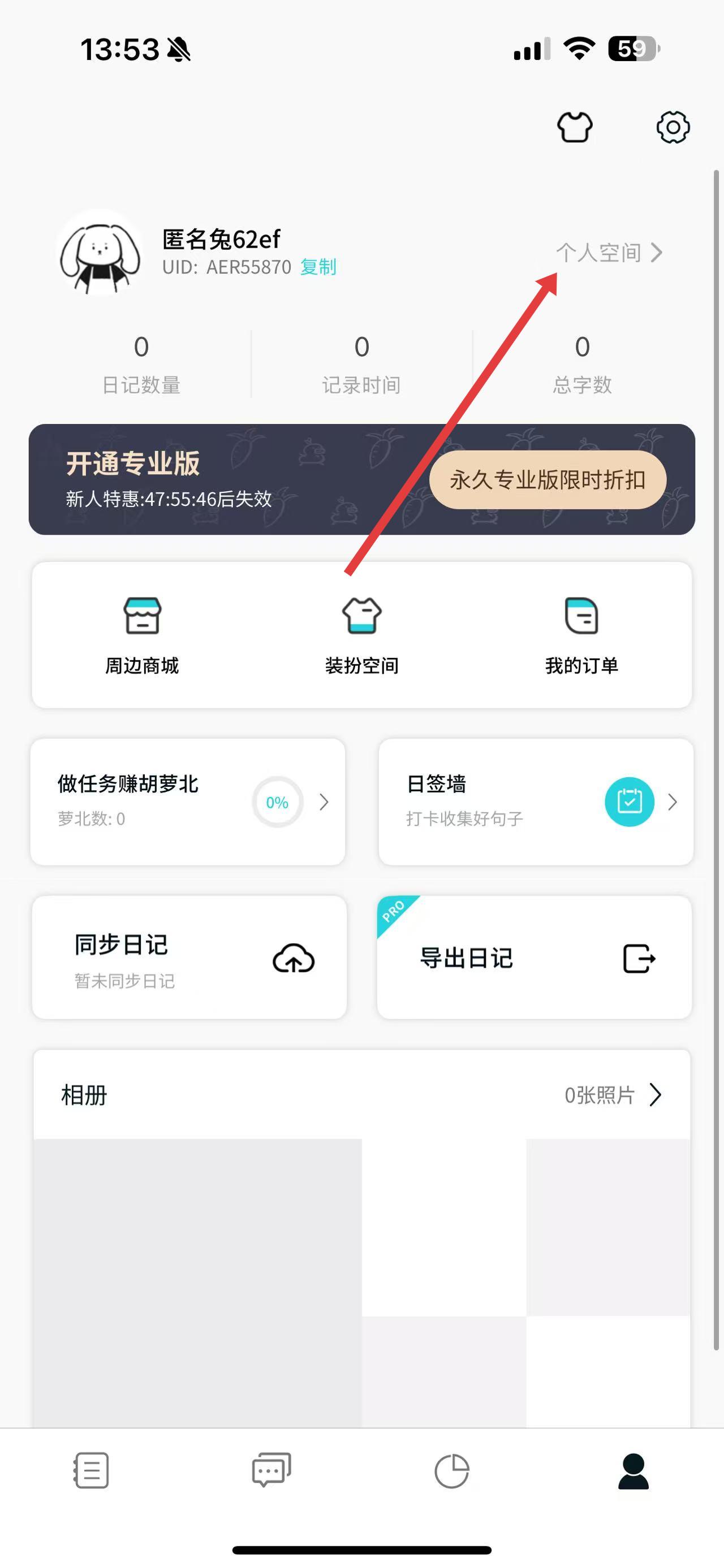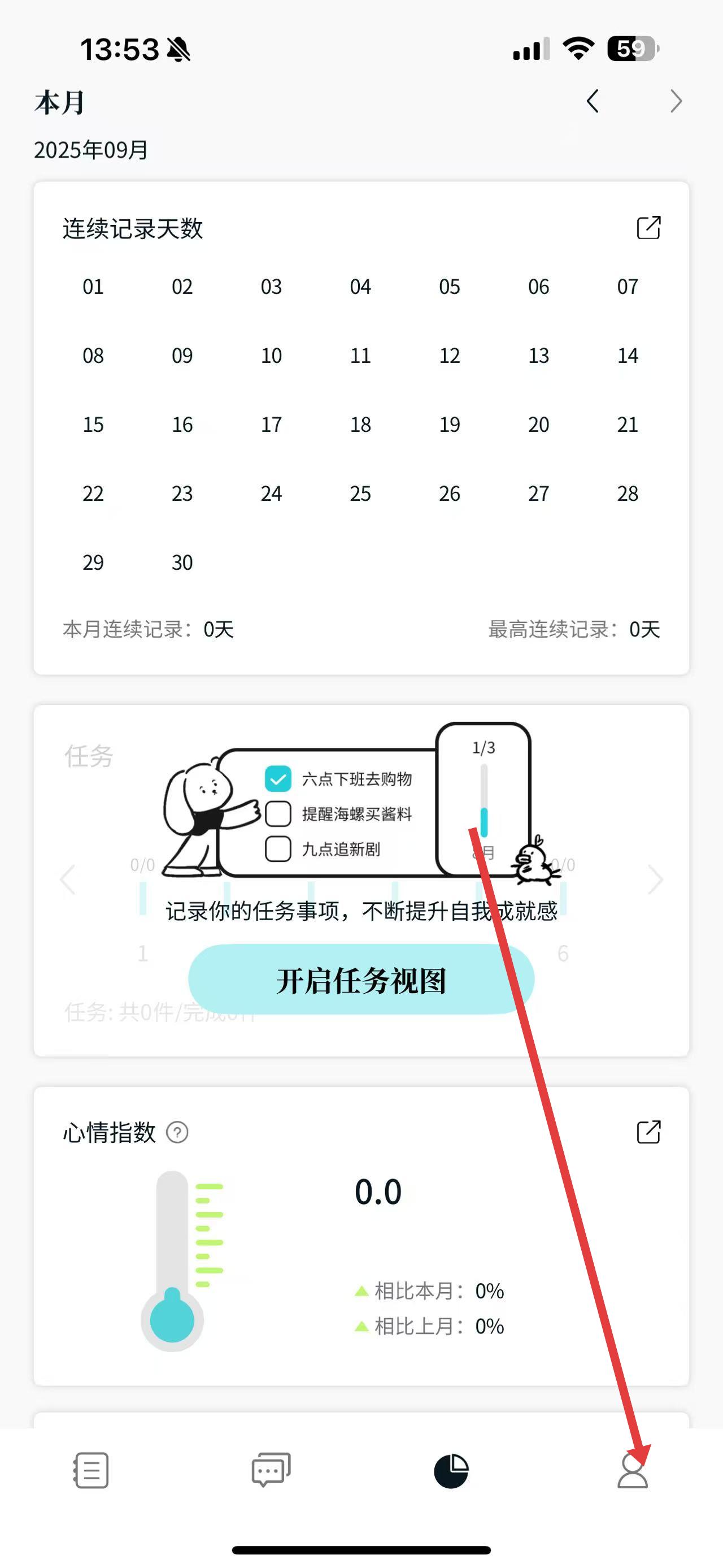 1、打开Moo日记APP,点击底部导航栏最右侧人像图标进入个人页面。