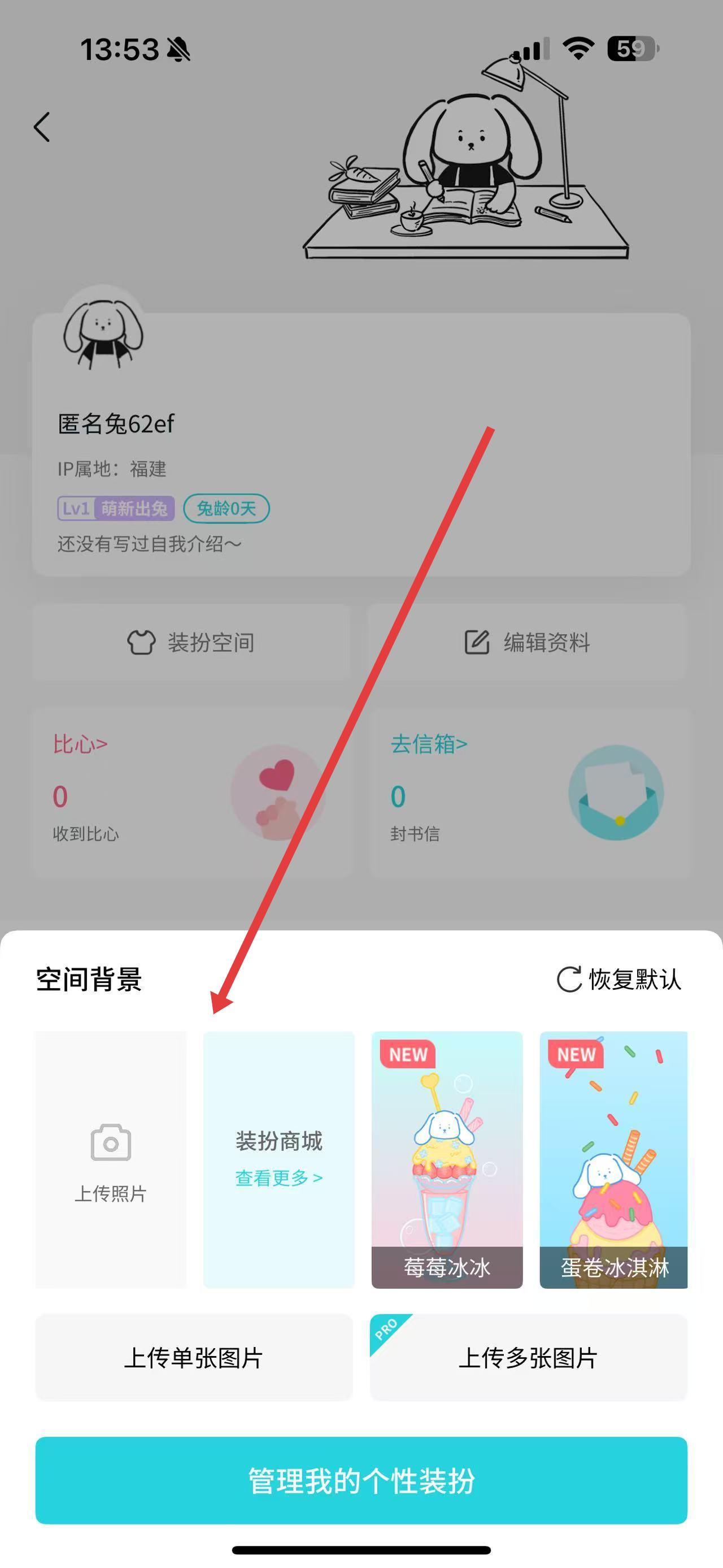 4、在弹出的空间背景设置界面中,选择上传照片或点击装扮商城查看更多官方背景,即可完成背景更换。
