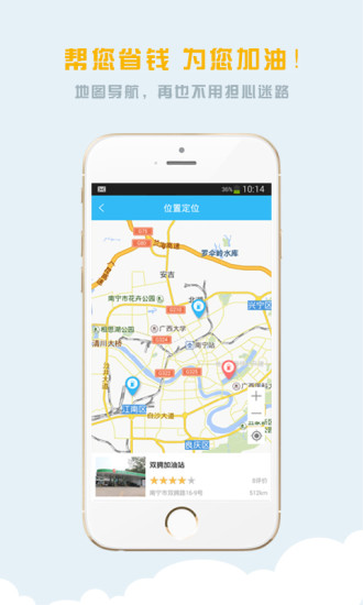油站定位:合作的加油站会显示在地图上,一目了然。