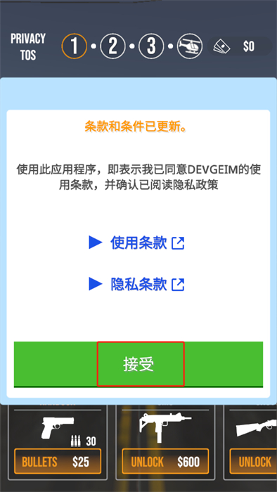 1、进入到场景内之后,玩家将需要进行屏幕中隐私条例的同意,点击【接受】按钮即可;