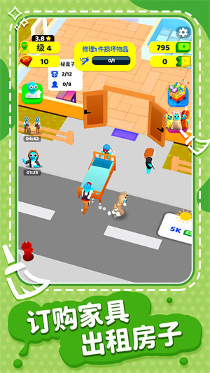 超级梦想家园手游是一款建筑搭建游戏,玩家将在游戏中自己的建造这个家园,家园中的一切都将由玩家亲自进行射击,充满了乐趣,玩家的目的就是建造好更舒适的房子,吸引更多的租客来进行租房,赚取更多的金币以及有用的道具。