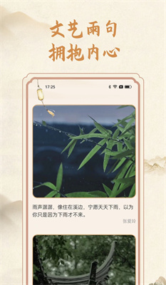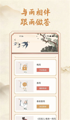 分时雨诗词学习app是一款免费的诗词学习软件,该软件支持从古至今的大量诗词,你可以在上面查看到各种优美诗句。软件还提供了分享的功能,你在看到觉得有趣或者优美诗词时,让其他人也能欣赏到,让所有都能开心。