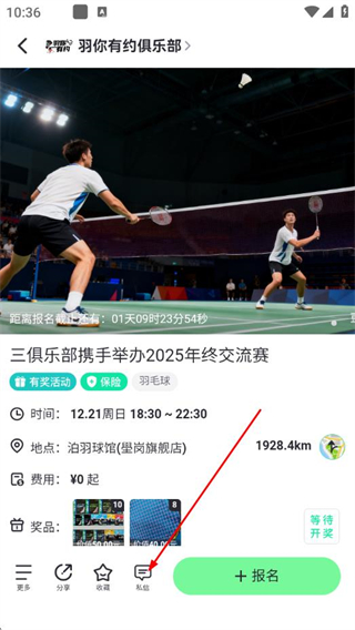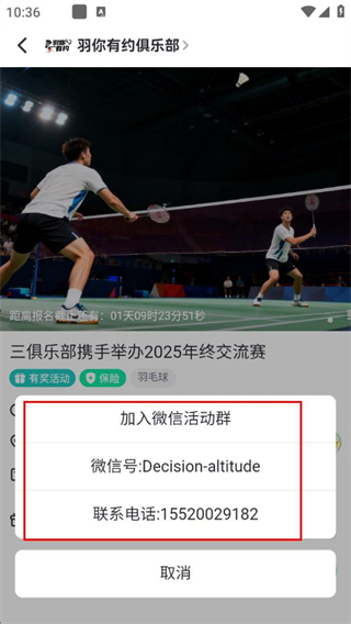 3、弹出的窗口中会显示主办方的联系方式,即可与主办方人员私信沟通。