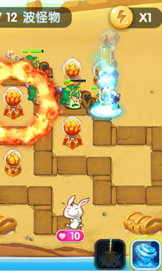5、点击右上方的X1即可加速操作,左上方显示为怪物波数;