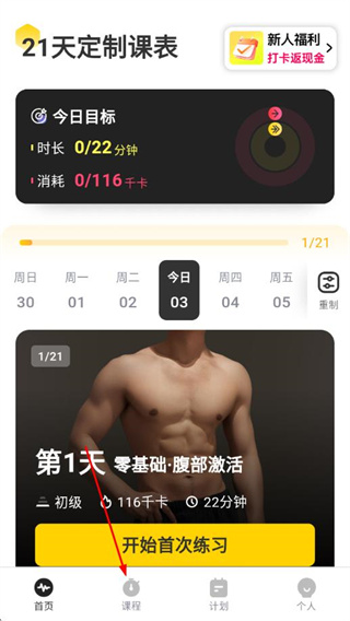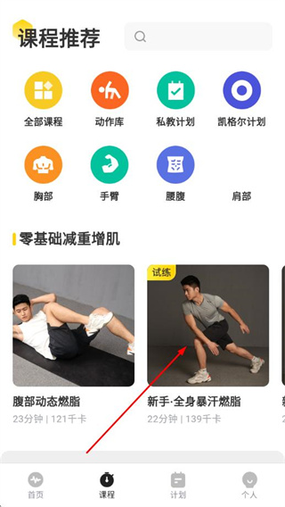 1、打开硬汗健身APP,点击底部课程,进入课程推荐页面。