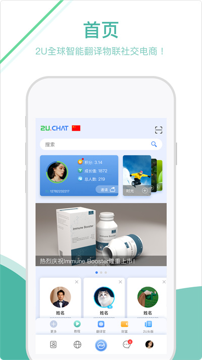 通友app又称为2U是一款可以带来智能翻译物联社交电商平台,平台拥有强大的语言翻译功能,可以实现快速的语言内容翻译查询沟通和交流,线上可以与好友或者客户轻松建设新的群组,将电商业务发展到更多的地方,为电商市场带来更全面的发展。