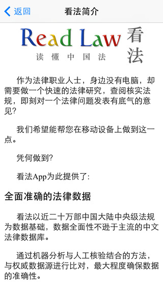 看法不仅仅是一个移动的法规汇编和法规查阅工具,而且是一个全功能的移动法律数据库,未来甚至会成为一个移动的法律垂直搜索引擎。