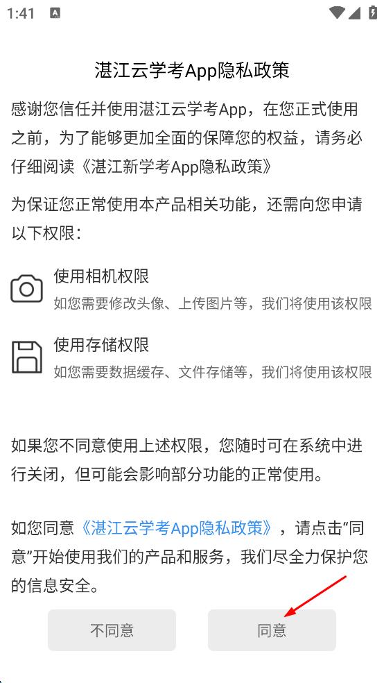 1、打开湛江云学考APP,进入隐私政策页面,仔细阅读相关内容后,点击“同意”按钮,进入登录页面。