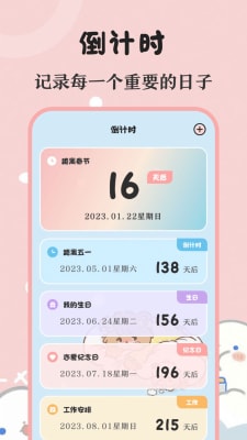 一款随时随地日期备忘录软件,它能提醒使用者别忘了重要日期,这个平台能帮你智能记录并惊喜别人,让别人不忘每一个重要日期,同时生日倒数日记软件也能智能地给您一些很好的礼物攻略,在时间设定好之后,就会进行提醒提示,免去忘了那些重要日子带来的难堪,不管是朋友,同学还是爱人,都能用这个生日提醒帮手工具或把派对结束时的图片印在一个有内涵的本子上,给人们留下一份美好的记忆。