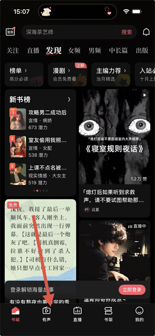 1、在盐言故事书城页面,点击有声选项,进入有声界面。