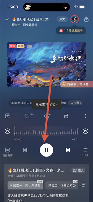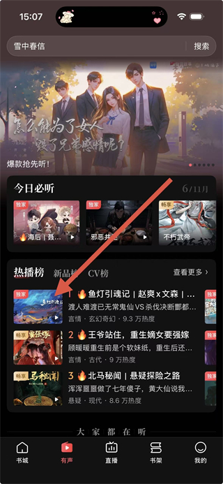 2、在有声界面,点击想要收听的听书作品封面,进入作品播放页面。