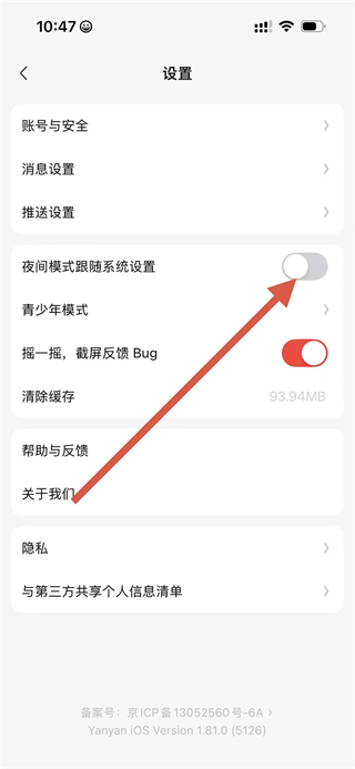 3、在设置页面,找到夜间模式跟随系统设置,点击其右侧开关,即可开启或关闭夜间模式。