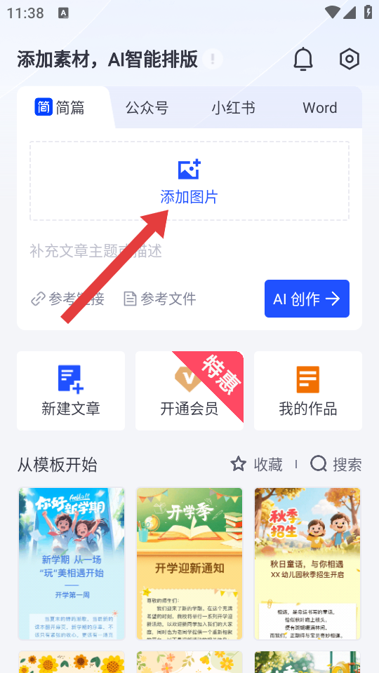1、打开简篇APP,在创作页面点击添加图片的按钮,进入本地图片选择界面。