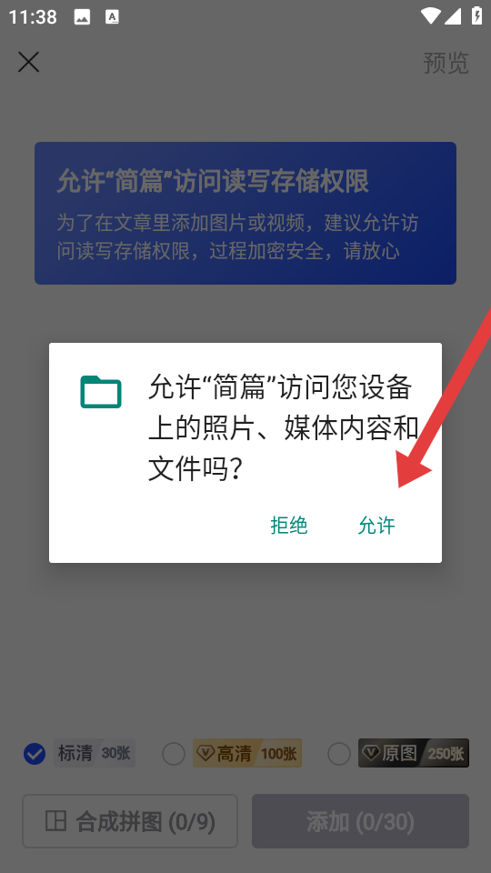 2、弹出权限请求框时,点击允许,授予应用访问本地存储的权限。