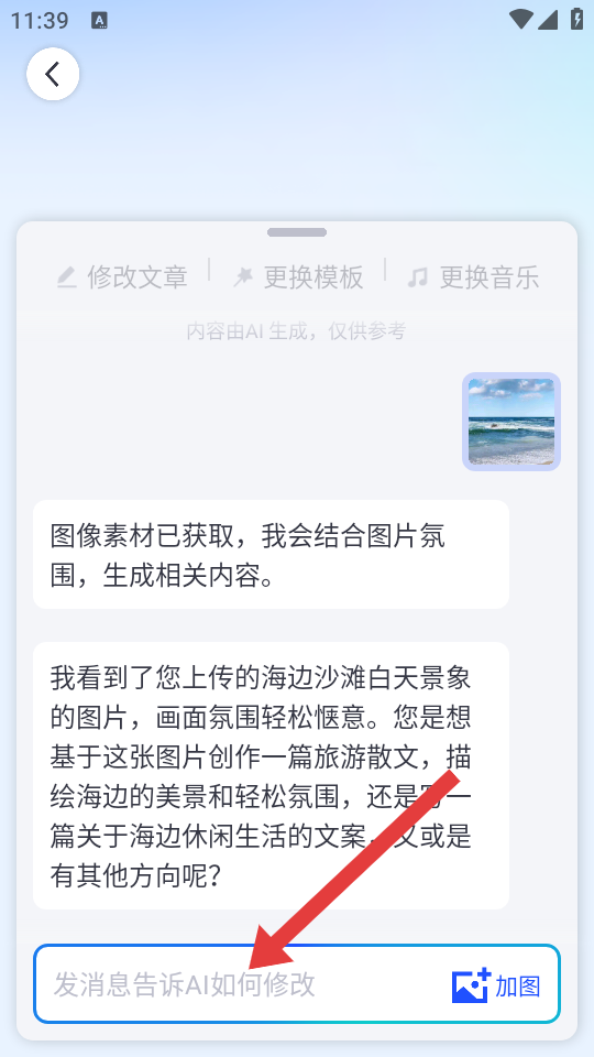 4、图片导入后若需调整,可在底部输入框中发消息告诉AI修改制作的方向。