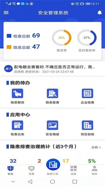 智慧建造app是管理工程施工专业性强的软件平台,一个开放协同移动应用,专注于施工现场、生产管控、工艺审批、安全和品质管控,致力于施工单位、建设单位和监理单位之间现场管理的高效协同,简单易操作的施工项目管理软件,可以让你通过app更好的管理自己的施工现场,节省相关管理人员的时间,帮助他们更高效的完成项目流程。