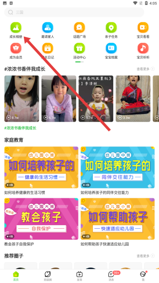 1、在APP首页,点击顶部成长相册图标,进入家庭相册管理页面,开启家庭相册添加流程。
