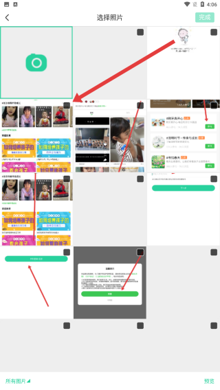 3、在进入到选择照片界面中,浏览手机相册内容,勾选想要上传的宝宝照片,完成照片选择步骤。