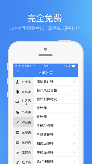 九大类型职业考试,覆盖128项子科目,公考类、医药类、外语类、工程类、财会类、金融类、资格类、软考类、计算机类。
