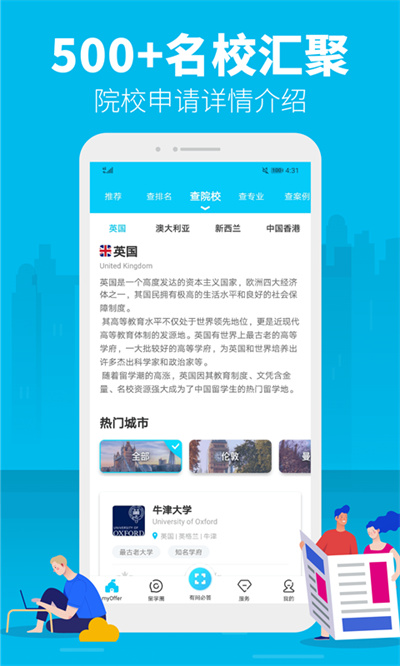 myOffer留学是专为现在外出留学的用户们打造的一站式的出国申请服务,用户们在这里了解全流程的留学申请条件,从中可以看到各种常用的工具内容,了解能力测评分析实现精准定位留学的潜力,方便选择更好的学院。
