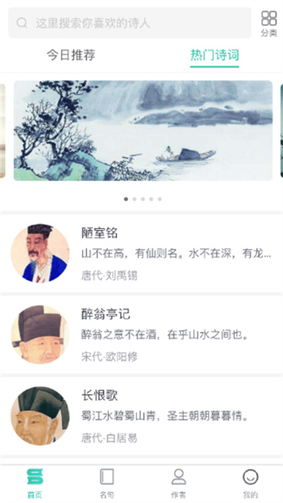 2、在软件上面可以根据自己喜欢的分类进行查找,搜索朝代或者是种类进行背诵阅读。