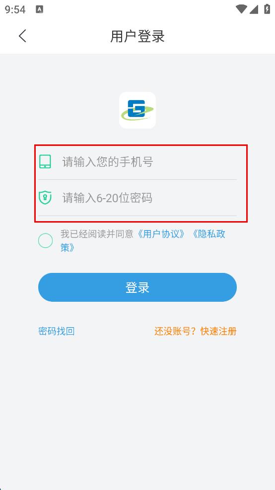 3、在用户登录界面,依次在“请输入您的手机号”和“请输入6-20位密码”输入框中,填写好手机号和密码。