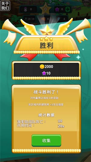 - 每次完成一次战斗都会获得一定数量或数量不定的金币和星星奖励,经过多次战斗积累后,玩家可以用获得的奖励购买新的设备、士兵、升级建筑等等,提升自己的战斗能力。