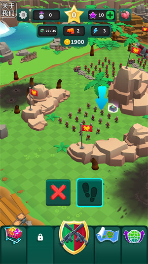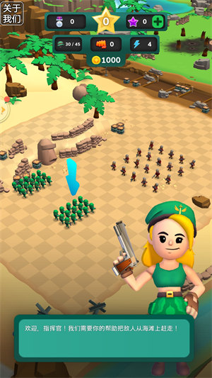 陆军指挥官游戏是一款卡通风格的策略放置游戏,游戏中,玩家将扮演一个军队指挥官,在游戏中,需要搭建自己的兵营,招募士兵并提升自己队伍的容量上限。随着游戏的进行,玩家还需要派遣士兵对敌军进行袭击,赢得战斗胜利并获得金币和星星奖励。