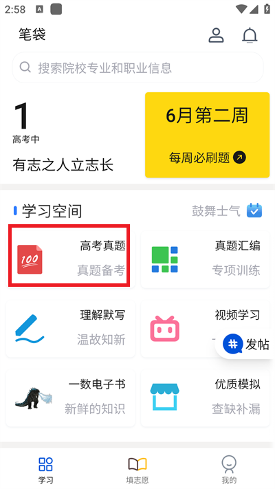 1、下载安装【笔袋app】之后打开进入到软件界面之中,在软件界面中点击【高考真题】就可以进入到试卷选择科目界面;