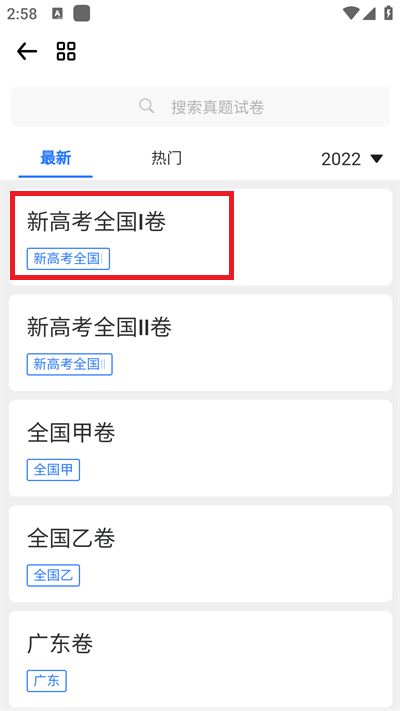 2、在高考真题界面,拥有多个全国高考卷可以选择,还有不同年份的试卷可以选,以下以【新高考全国1卷】为例,点击进入到其界面;