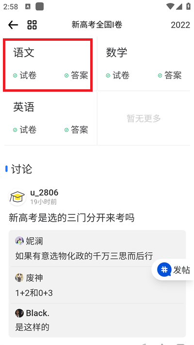3、在该全国高考试卷之中,会有语文、数学、英文三门主要课程的试卷,我们可以选择想要下载的科目点击进入到其界面;