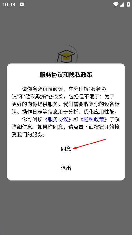 1、打开该学习类APP,弹出服务协议和隐私政策提示框,认真阅读后,点击“同意”,进入APP社区页面。
